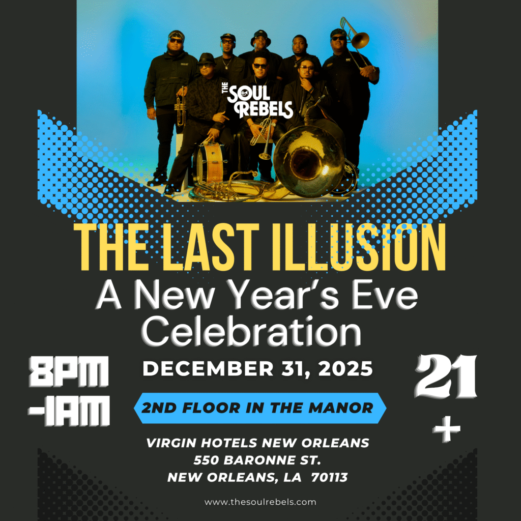 Step into The Last Illusion and celebrate New Year’s Eve like never before at Virgin Hotels New Orleans. On the 2nd floor, The Soul Rebels bring their legendary New Orleans brass and energy, filling The Manor with unforgettable live music, cocktails, and an electric atmosphere.